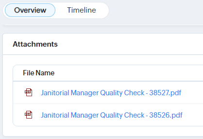 - On the Overview subtab, scroll down to the Attachments section. Any Quality Check summaries sent from Janitorial Manager will be listed.