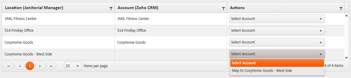 - In the Action column, map the Location in Janitorial Manager to the matching Account in Zoho.