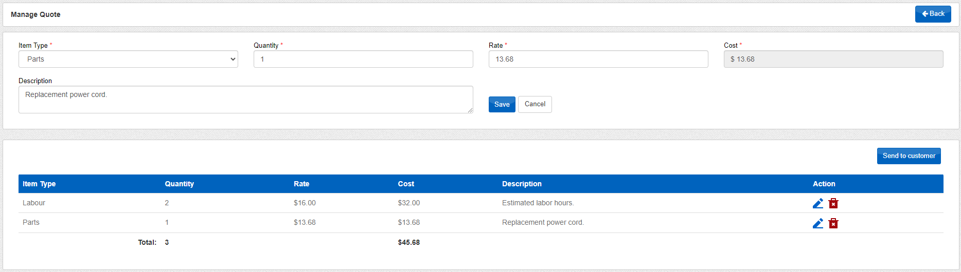- Estimate (Quote) Details - Item type, quantity, rate, cost, and description.