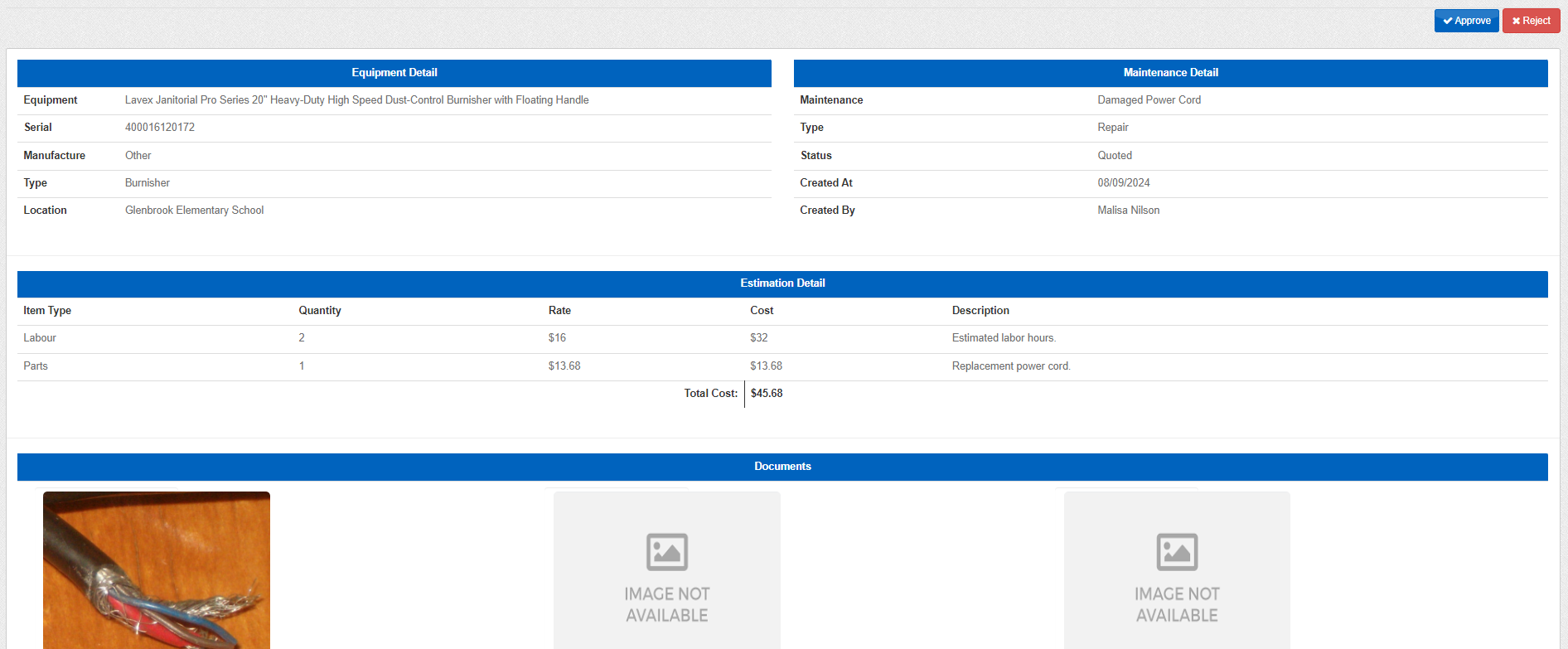Vendor-managed maintenance requests allow customers to approve or reject equipment maintenance estimates. This feature is designed for companies managing client-owned equipment.