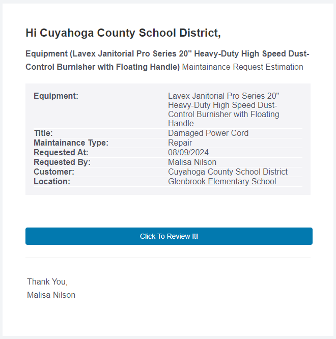 - The quote will be sent to the Primary Email Address associated with the equipment's assigned Customer.