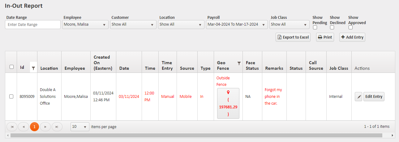 Punches made using Forgot to Clock In/Out are automatically pending. Pending punches must be approved to appear as valid time on payroll reports.