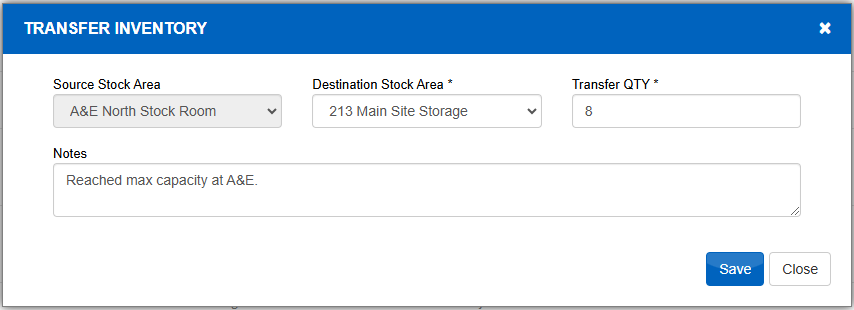 - Destination Stock Area* - Where the item(s) will be moved to. Items can only be transferred to assigned stock areas.