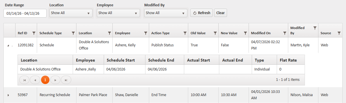 This report details changes made to schedules. Records with the same Ref. ID were modified together.