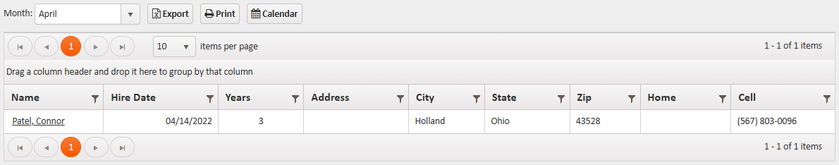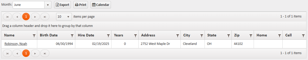 Shows all employee anniversaries (based on Hire Date) during the selected month.