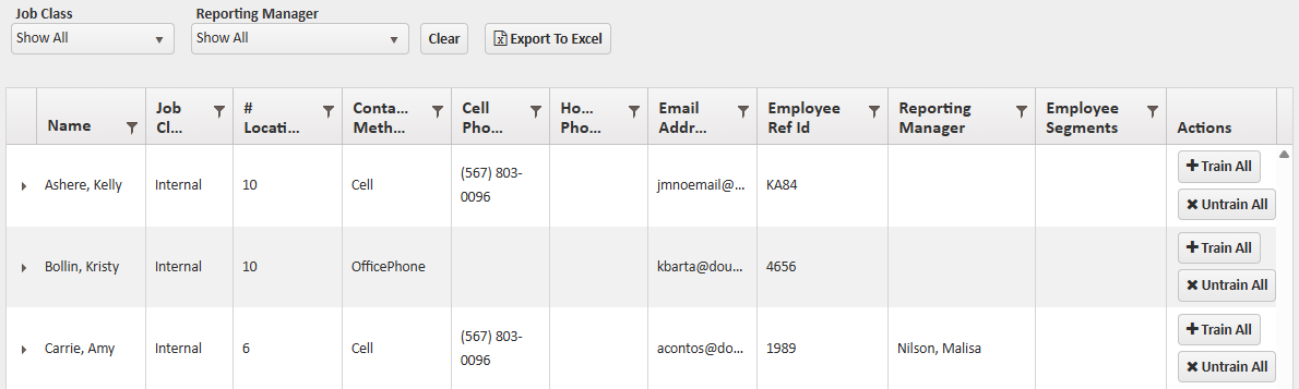 Shows which locations employees are trained on and includes employee contact information. Use Train All or Untrain All in the Actions column to make changes in bulk.