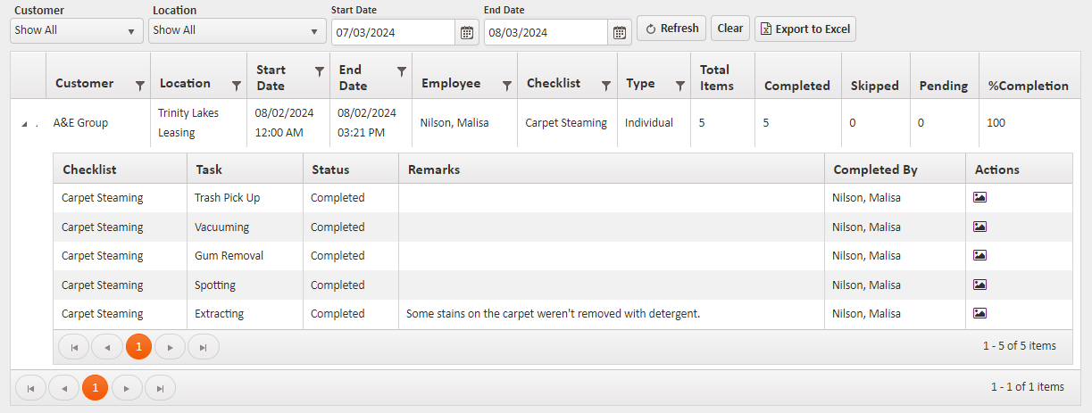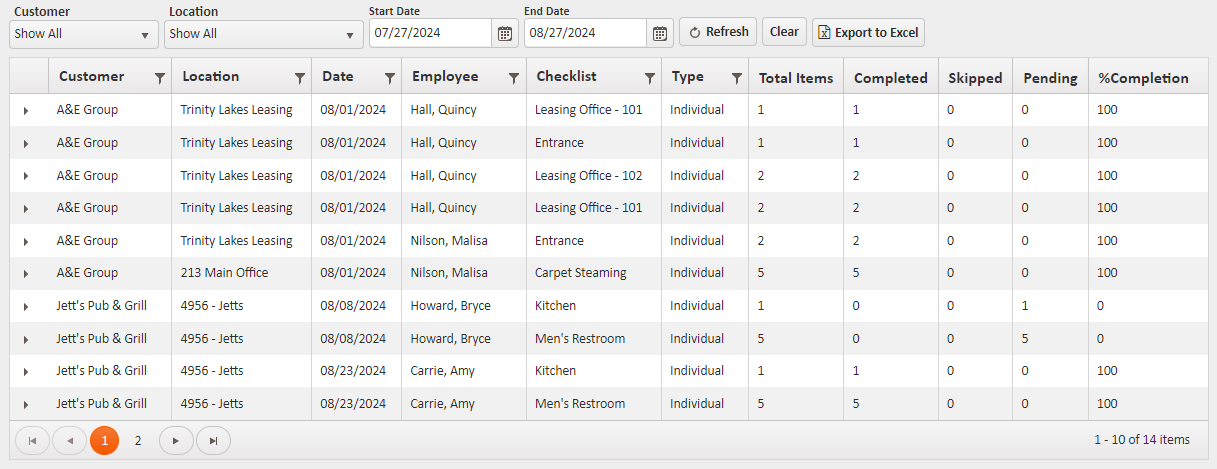 The following reports show details on location, work order, and area checklists. All reports can be exported to Excel.
