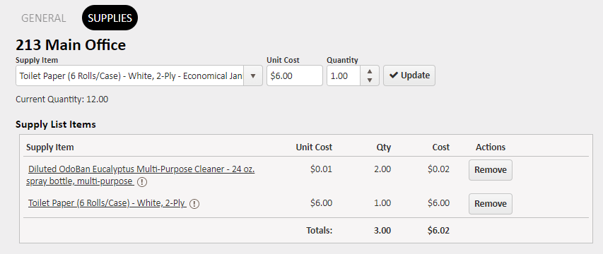 - To adjust the quantity after it has been added, select the supply item, edit the quantity, and select Update.