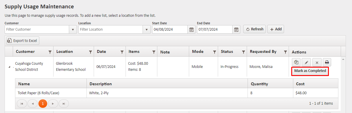 - Select the Customer, Location, and Date. This should be when and where the supplies were consumed.