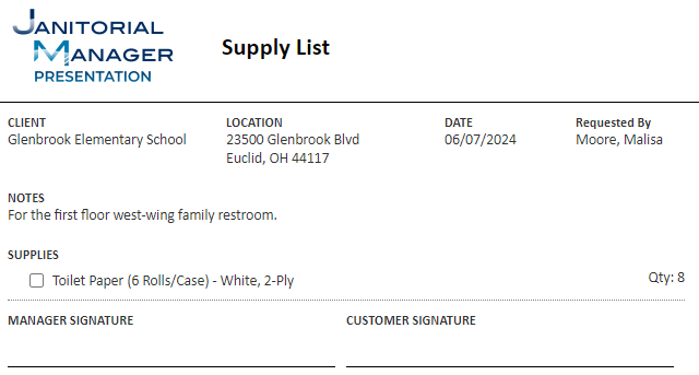 This action will generate a printable supply list. This shows any notes and supplies added to the request and includes a section for a manager and customer signature.