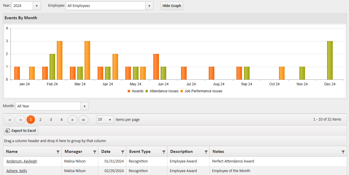 Awards, attendance incidents, and performance issues can be recorded per employee.