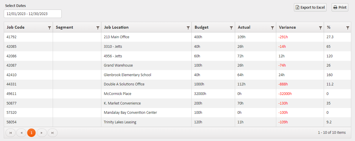 This report shows the budgeted labor hours versus actual labor hours per location.