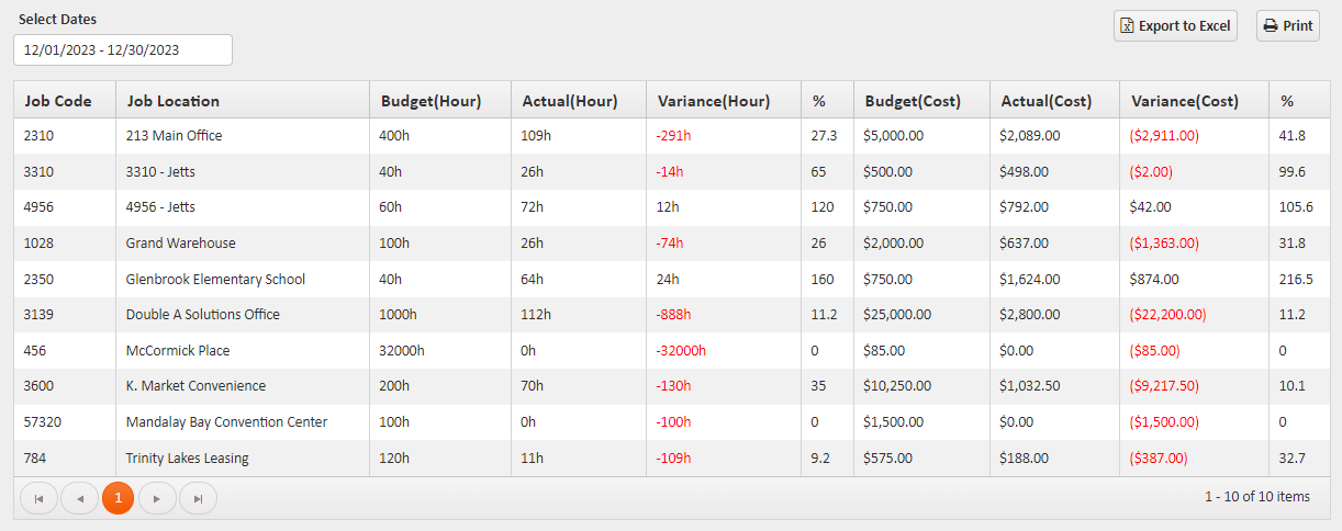 - Variance (Cost) - The difference between the Budget (Cost) and Actual (Cost) fields.
