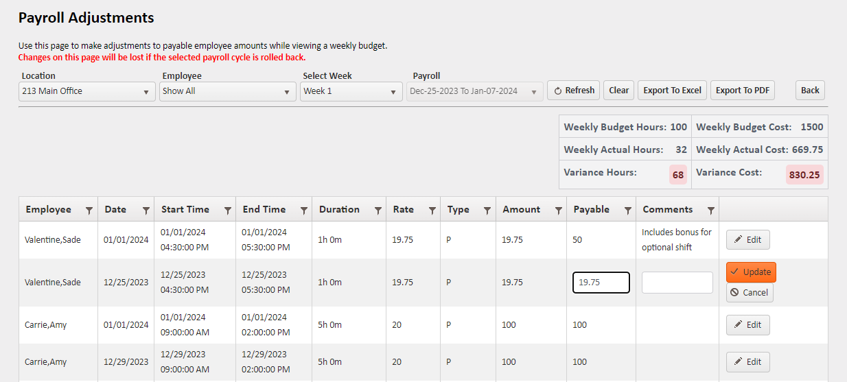 The Payroll Adjustments report is used to edit payable employee amounts while viewing a weekly budget. This report is mainly for companies that use an output-based or piecework pay system.