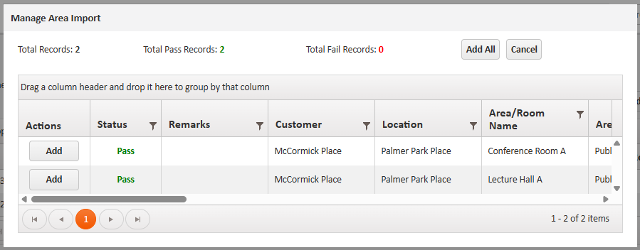 - On the Area Import page, click Upload Area Spreadsheet and open the file.
